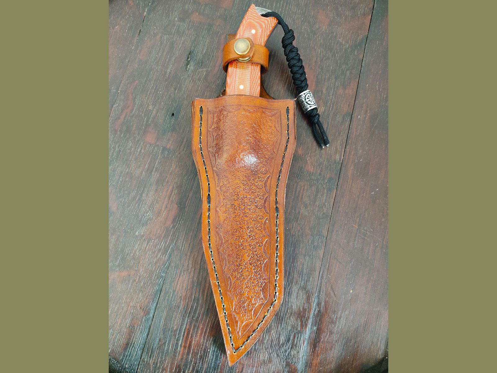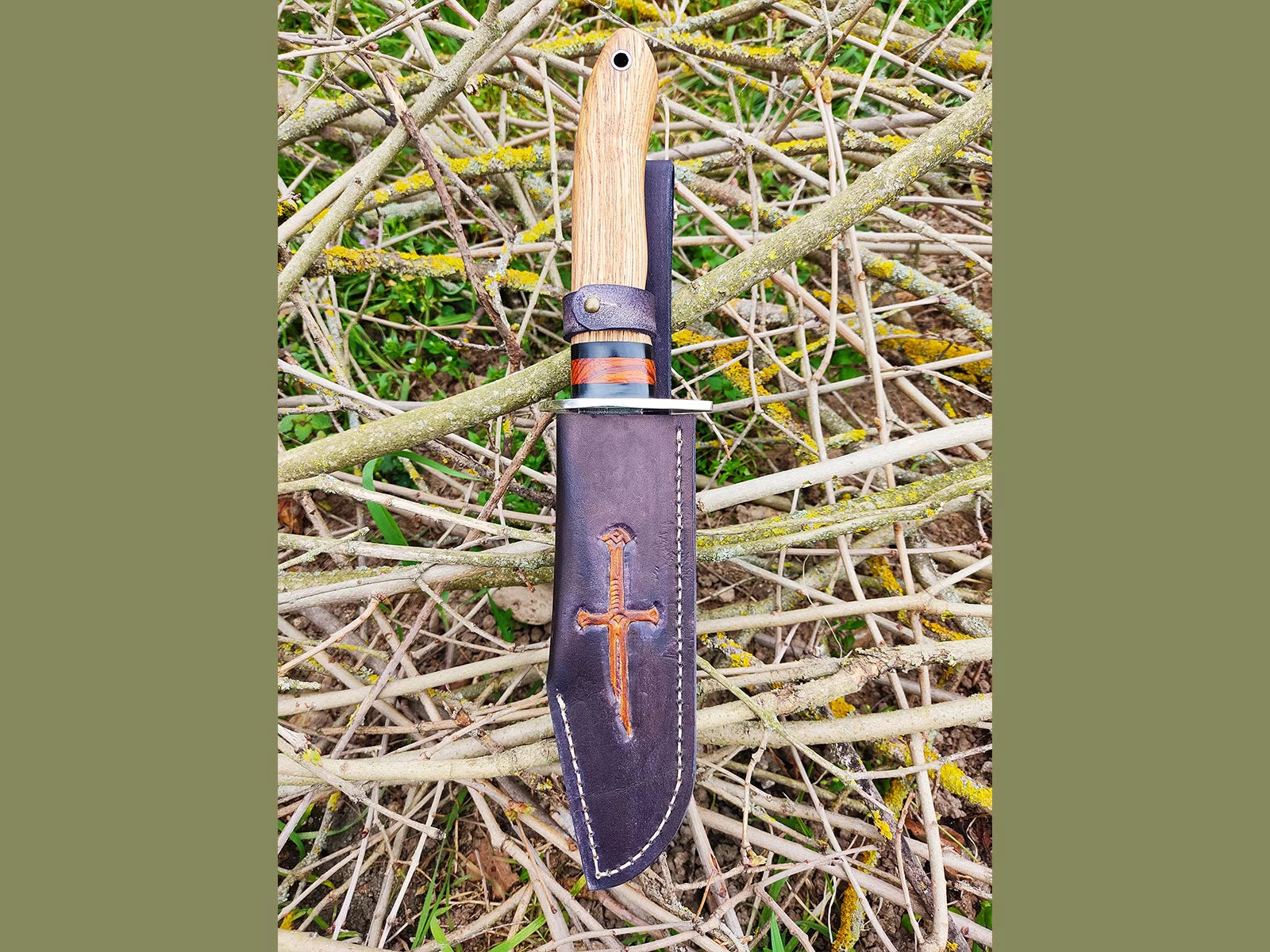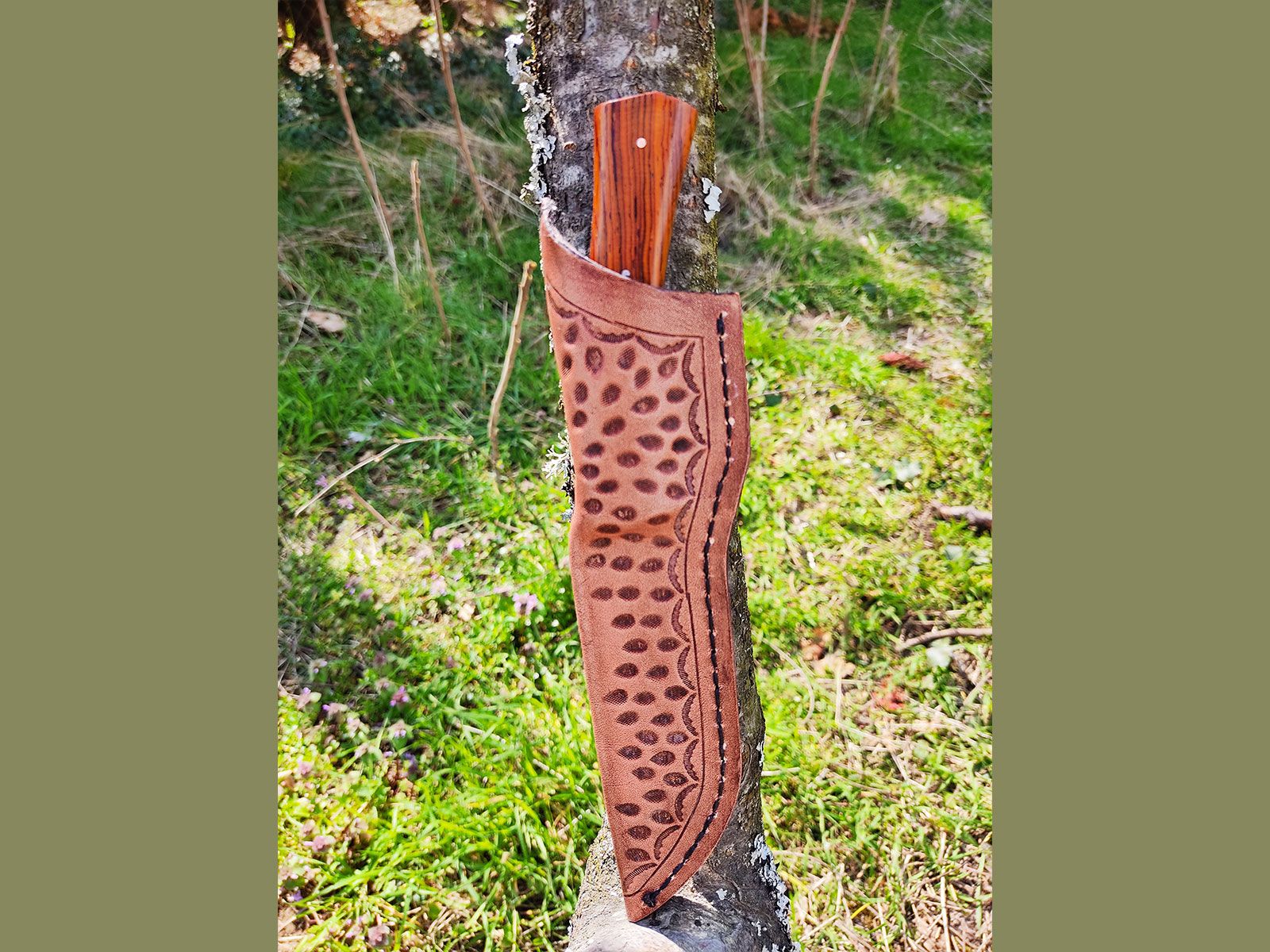 Pour chaque couteau fixe, je confectionne l'étui entièrement à la main. Je peux le réaliser dans un style simple et traditionnel, ou y ajouter une marque ou un logo personnalisé. Il suffit que le design soit simple et facile à reproduire.