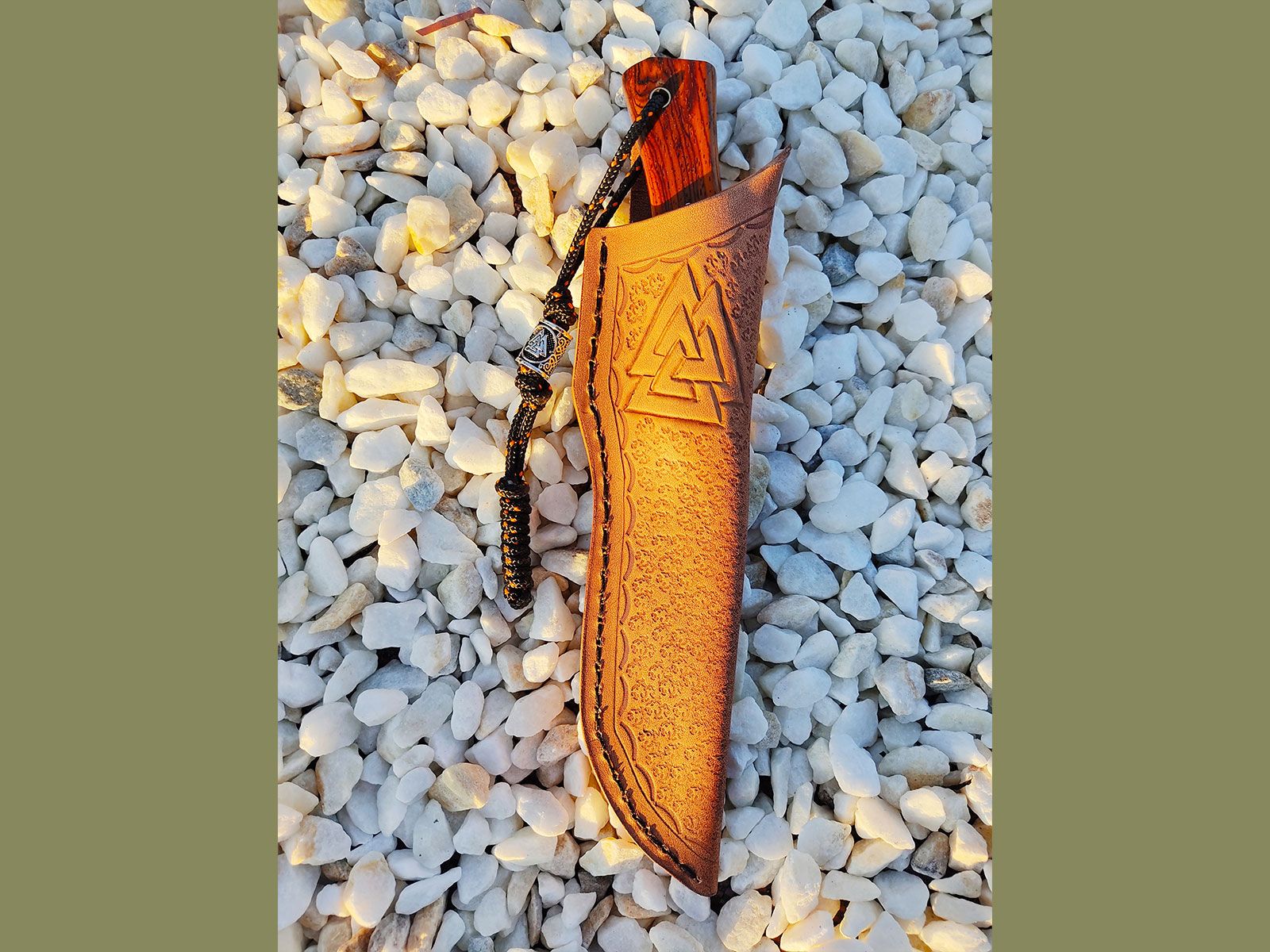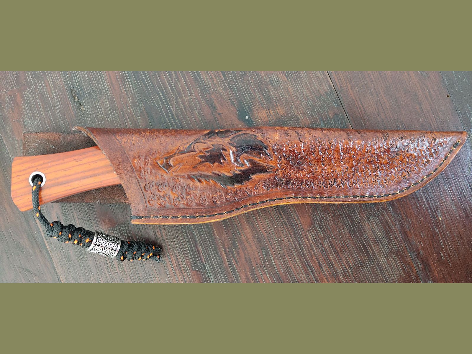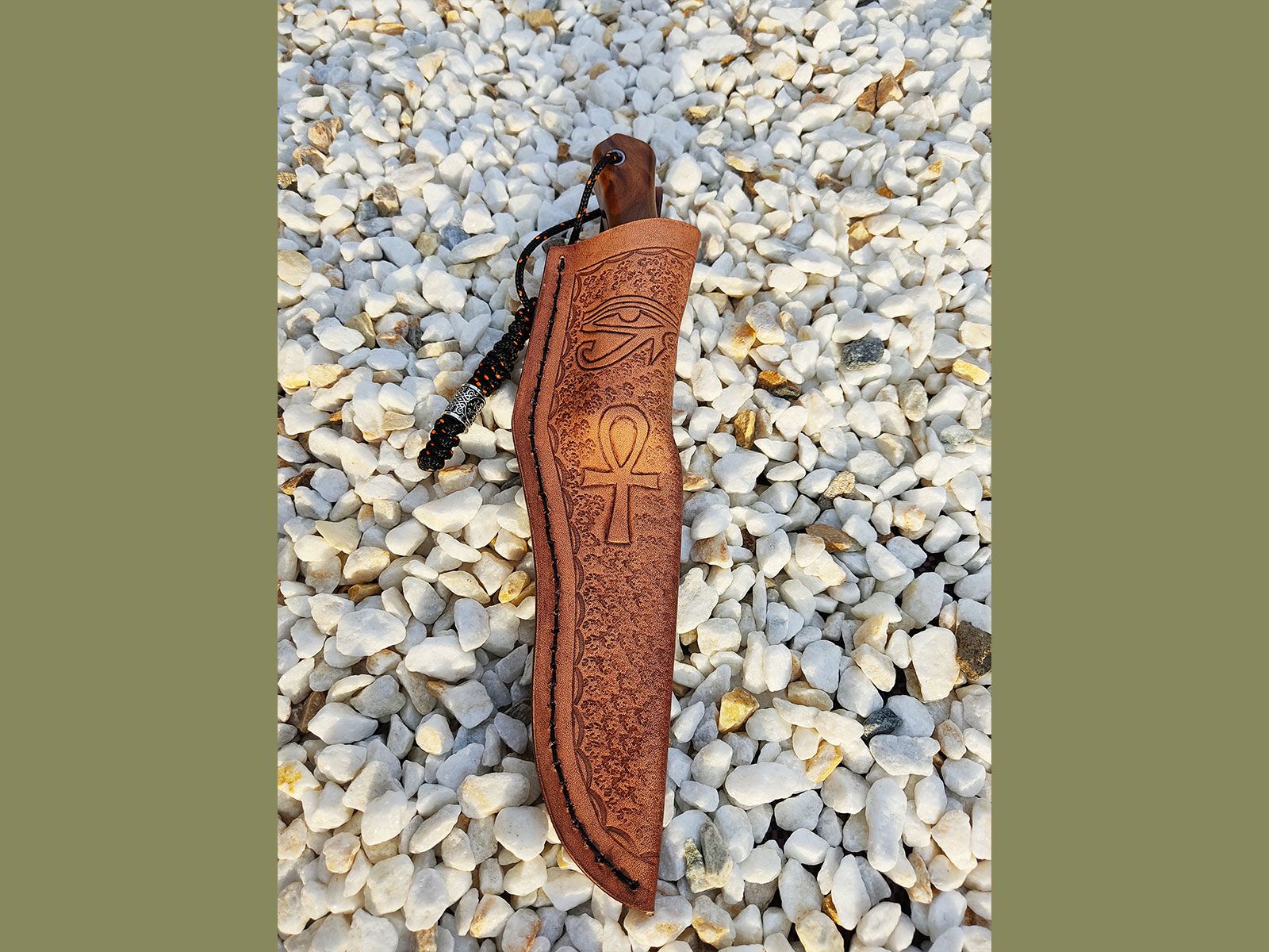 Pour chaque couteau fixe, je confectionne l'étui entièrement à la main. Je peux le réaliser dans un style simple et traditionnel, ou y ajouter une marque ou un logo personnalisé. Il suffit que le design soit simple et facile à reproduire.