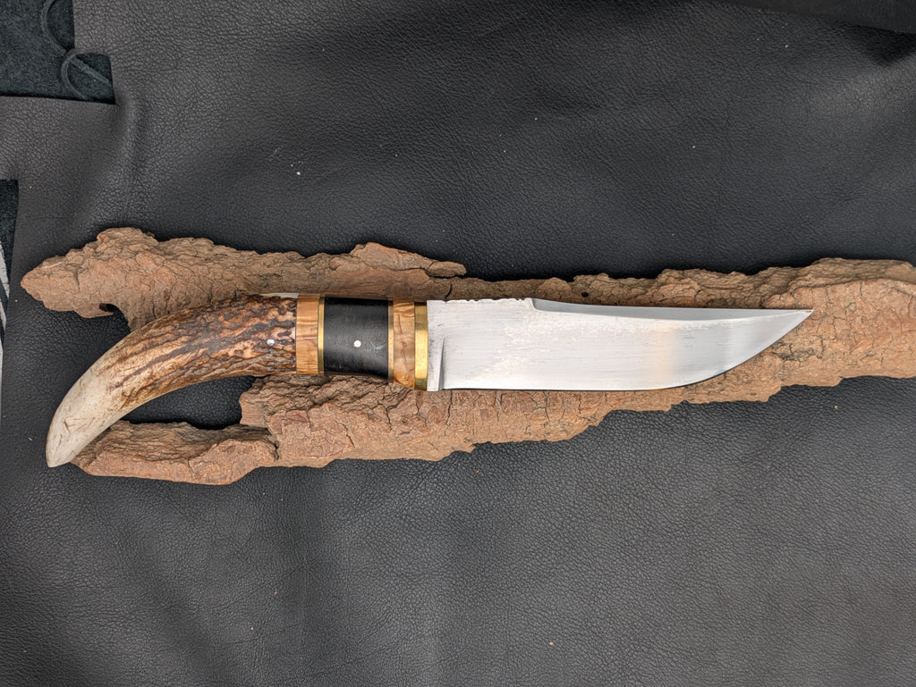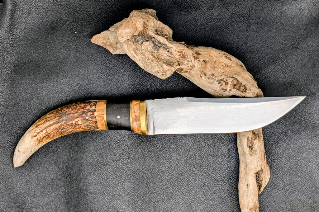Manche Multi-matériaux : Une composition artisanale unique alliant la rudesse de la pointe de bois de cerf, l'élégance de l'ébène profond, la chaleur du bouleau et l'éclat du laiton.